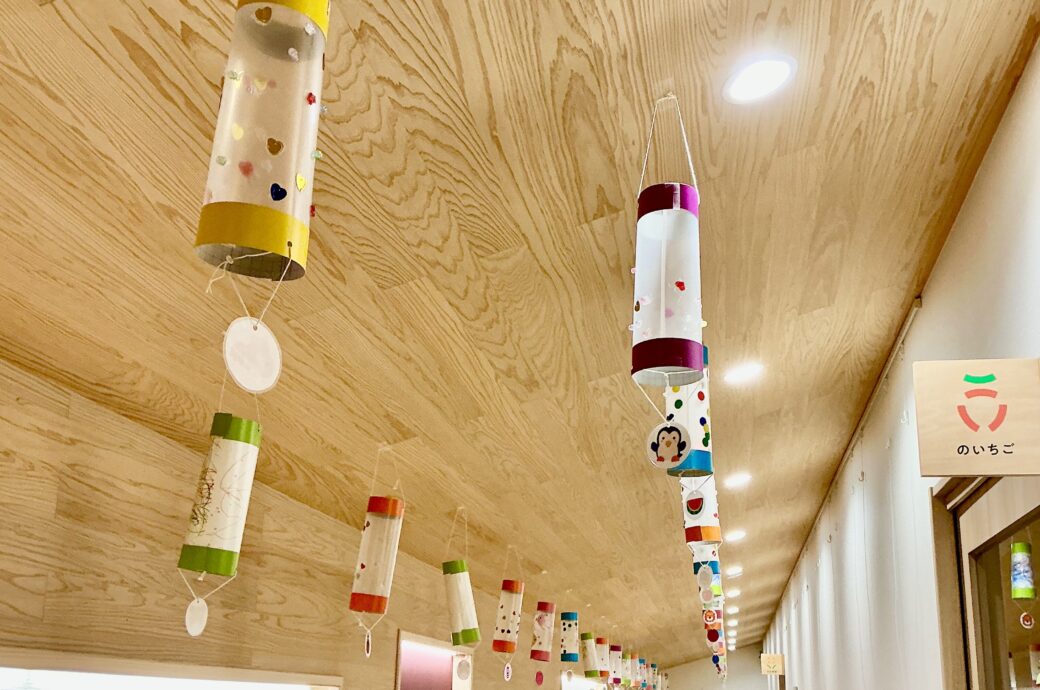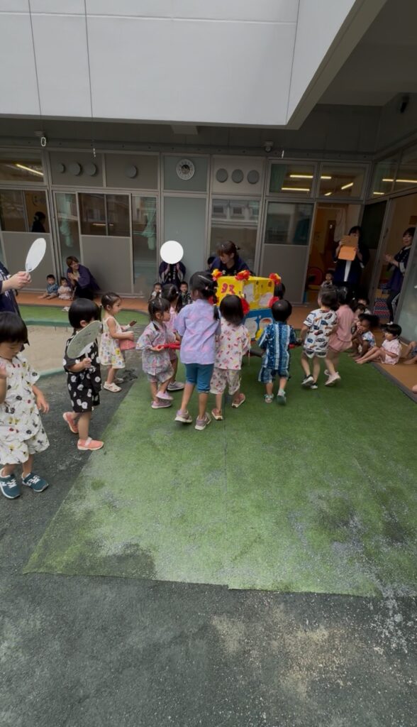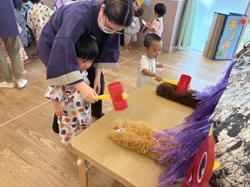 幼児クラスの子ども達が主体となり、お神輿を作ったり手作りの太鼓や鈴を作り夏祭りの準備を進めてきました。当日は、乳児クラスの子ども達は保育者と一緒にお祭りの雰囲気を楽しみ、幼児クラスの子ども達は自分たちで作ったお神輿を担いで園内を練り歩きました。地域の小学校のお兄さんお姉さんにヨーヨー釣りやモンスターパニックなどの出し物のお手伝いをしてもらい、一緒にゲームを楽しみました。
