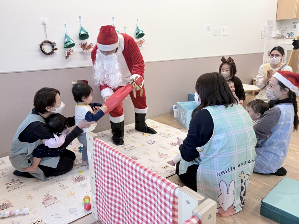乳児クラスの子の中にはびっくりして涙が出る子もいましたが、サンタさんからのプレゼントに大喜びの子どもたち。