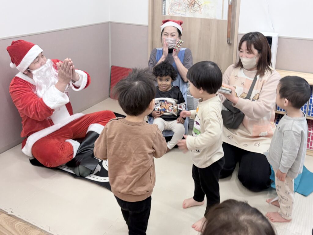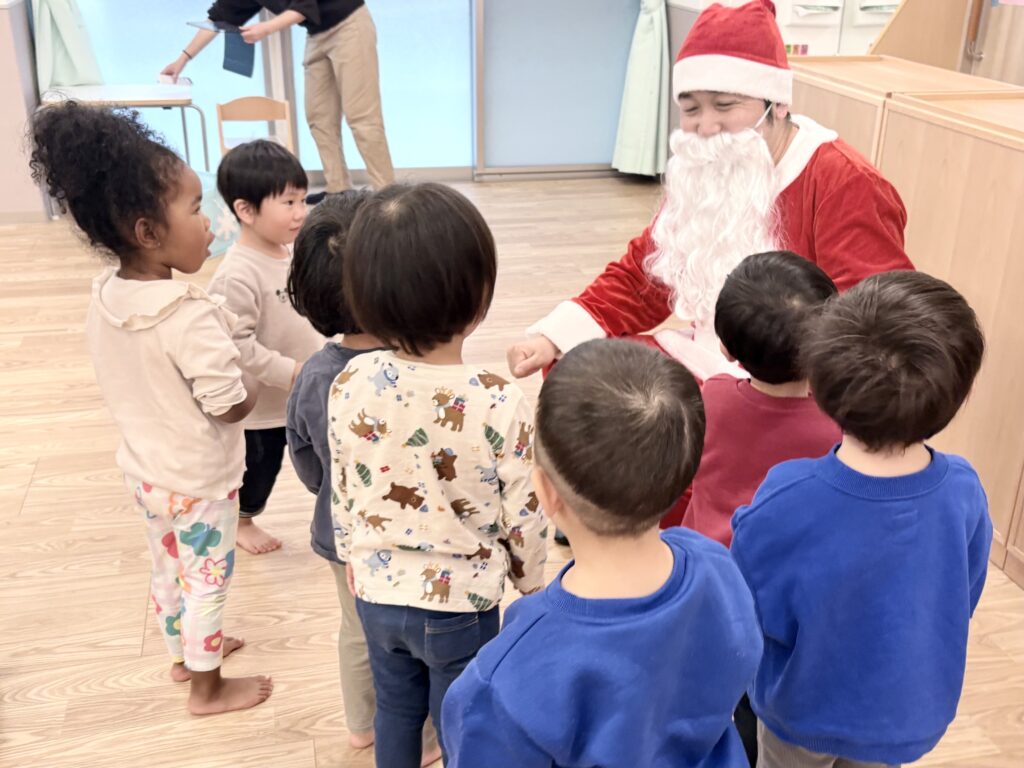 幼児クラスには年末子ども会への「招待状」が届きました。何がはじまるのか、わくわくドキドキの子ども達。職員から子ども達への合奏のプレゼントやサンタさんとのクイズや質問コーナーなど大盛り上がり!サンタさんからプレゼントをもらい、最後には一緒に写真も撮れて嬉しそうな子ども達の笑顔が溢れた素敵な会となりました!