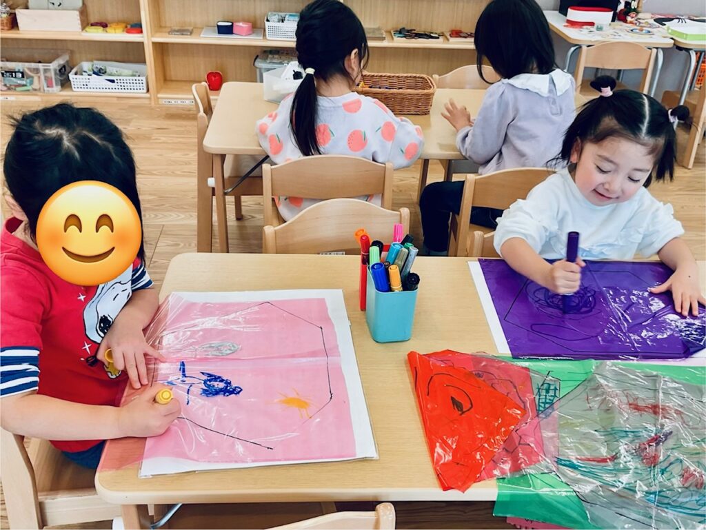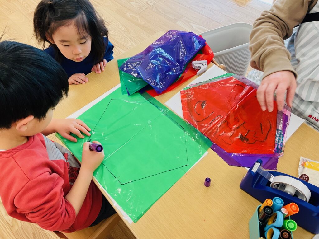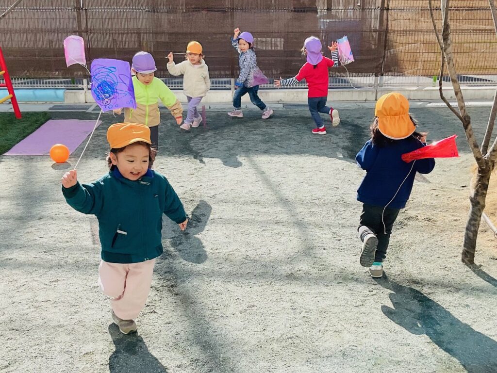 幼児クラスでは、福笑いやコマ回しなど新年の伝承遊びにふれたり、自分の凧を作って園庭や公園で凧あげをして遊びました。